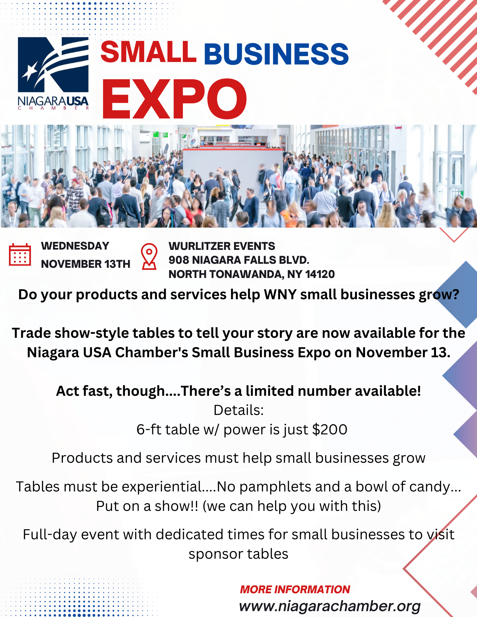 Join us on November 13, 2024, at the iconic Wurlitzer Events for a day of innovation, learning, and unparalleled networking opportunities. The Niagara USA Chamber of Commerce proudly presents the Small Business Expo 2024: Innovate & Elevate, a curated event designed to inspire and empower businesses across the region.